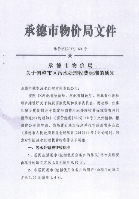 《承德市物價局關于調整市區(qū)污水處理收費標準的通知》承價字【2017】60號