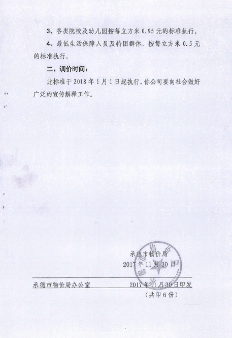 《承德市物價局關于調整市區(qū)污水處理收費標準的通知》承價字【2017】60號